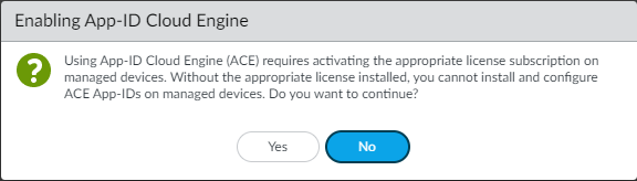 ACE is disabled by default.Click OK.(Only if enabling ACE) If you are enabling ACE, the Enable App-ID Cloud Engine dialog appears.