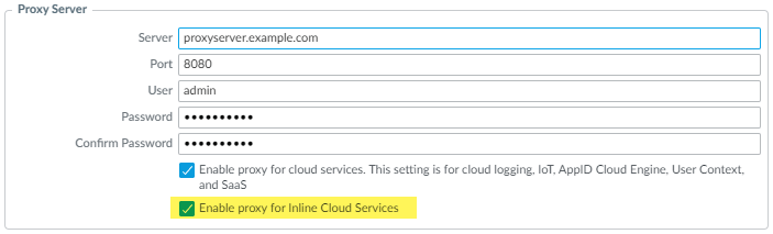 - (Explicit Proxy Deployments [requires PAN-OS 11.2.3 and later or PAN-OS 11.1.5 and later]) Enable firewalls using a proxy server to access servers that facilitate requests generated by various features using inline cloud services.