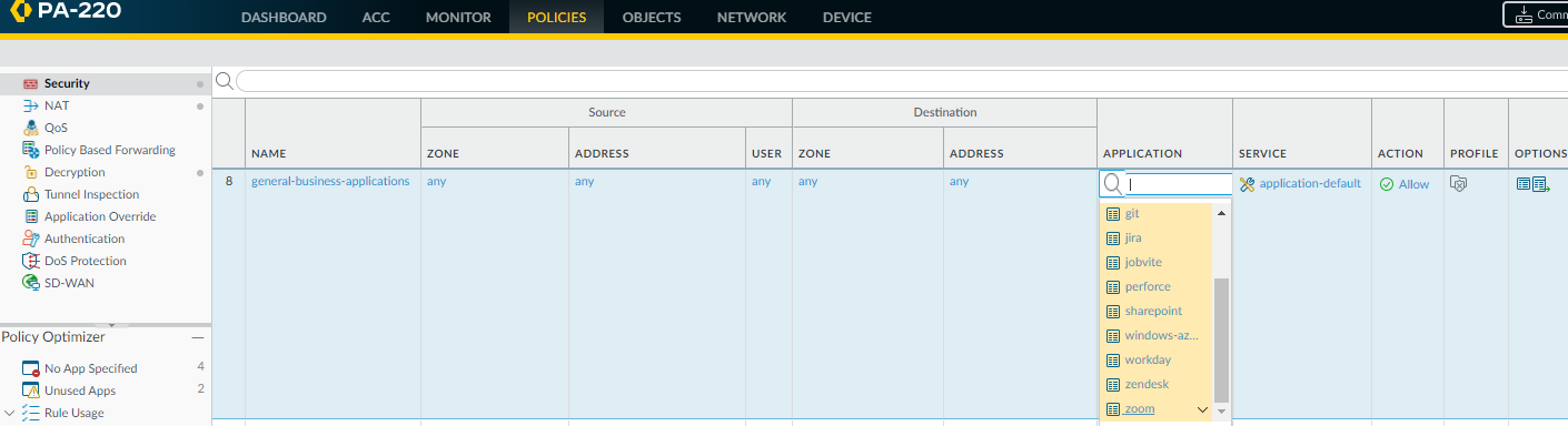 - You check the port-based internet access rule and discover that the rule has seen general business applications and that you need to allow some of them for business purposes.