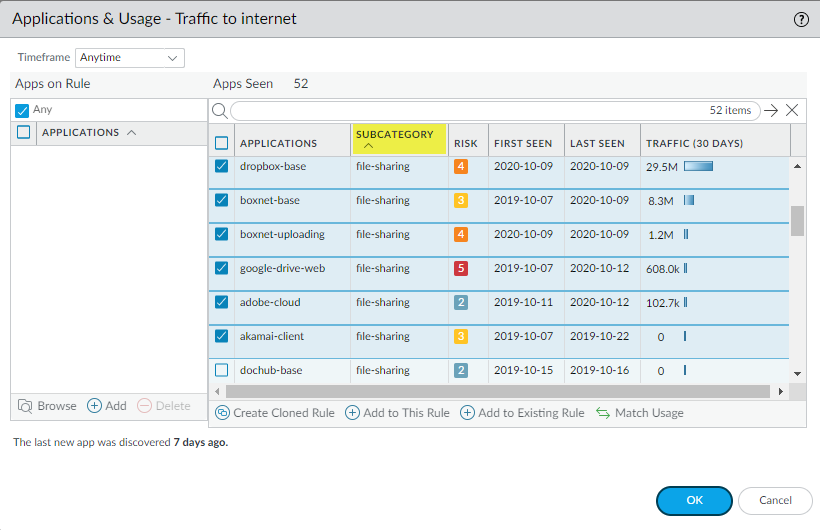 For example, click Subcategory to sort the applications, scroll to the file-sharing subcategory, and then select the applications you want to allow. Alternatively, you can filter (search) for file-sharing applications.