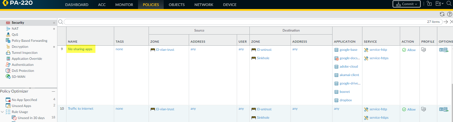 7. In PoliciesSecurity, the cloned rule (file-sharing-apps) is inserted in the rulebase above the original port-based rule (Traffic to internet).