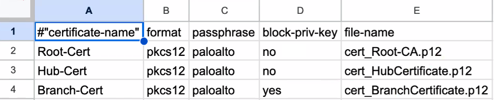 1. Download Sample CSV to download and save the Certificates.CSV template. Populate the template with certificate related information: certificate name, format, passphrase, block private key, and file name.