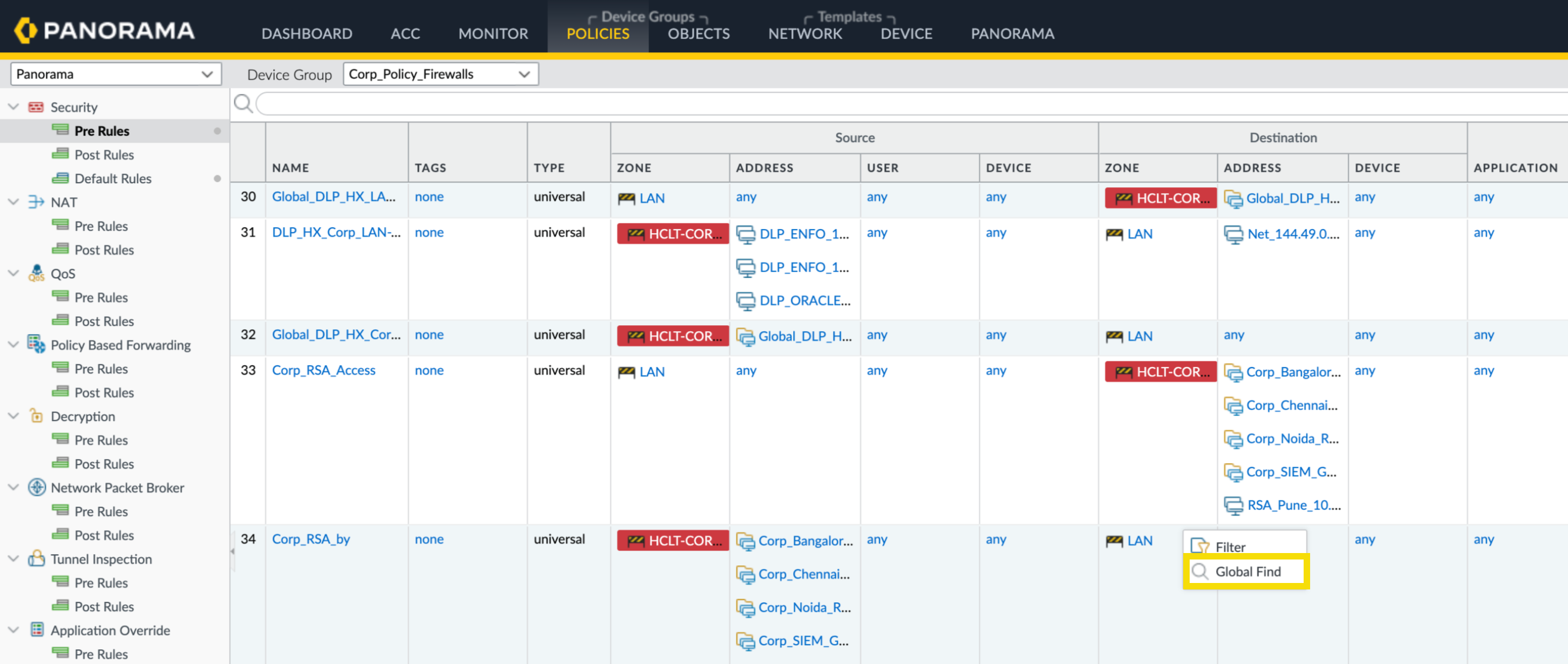 Search tips:- If you initiate a search on a firewall that has multiple virtual systems enabled or if custom administrative role types are defined, Global Find will only return results for areas of the firewall in which the administrator has permissions. The same applies to Panorama device groups.