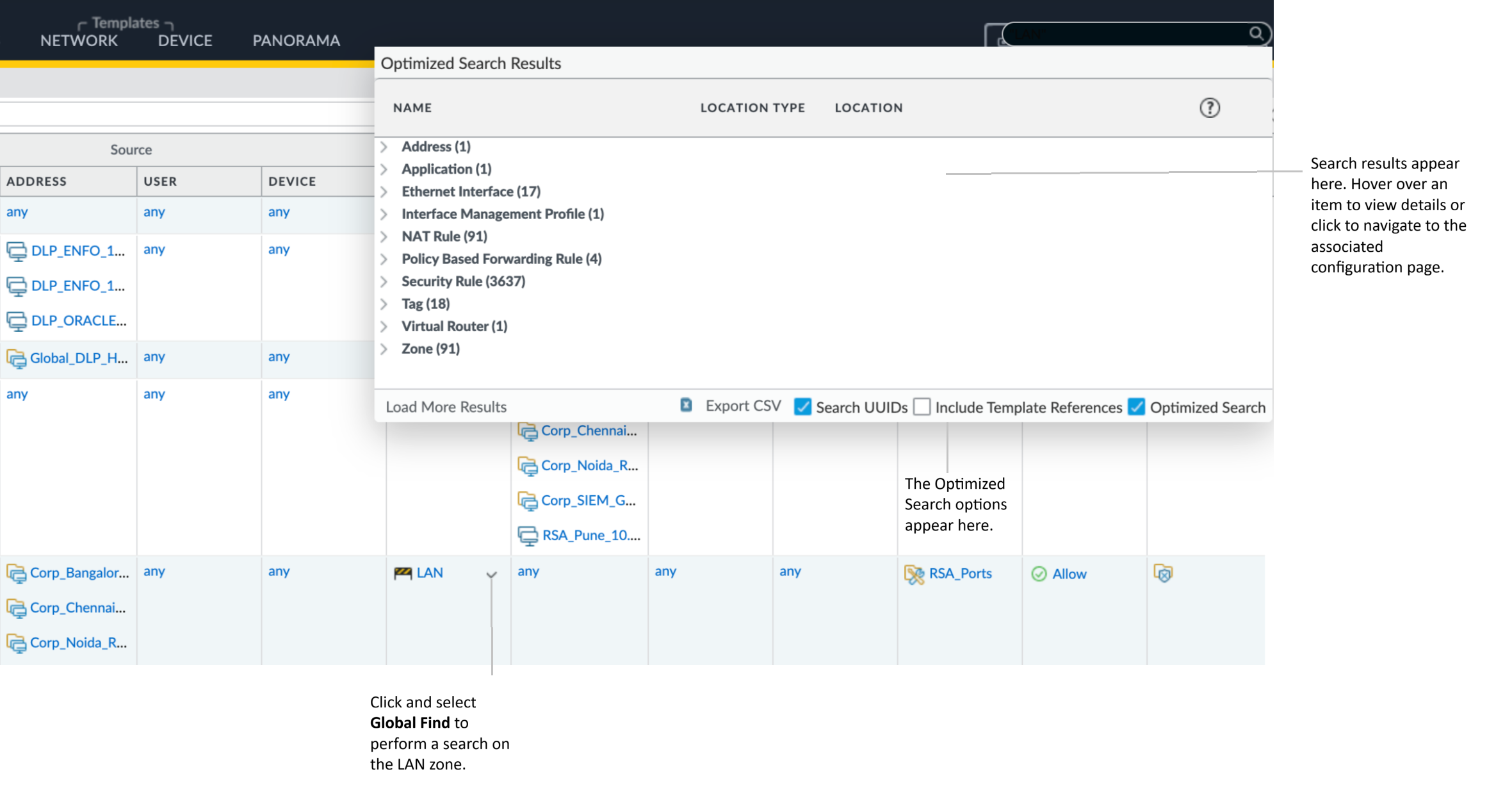 For example, click Global Find on a zone named LAN to search the candidate configuration for each location where the zone is referenced.