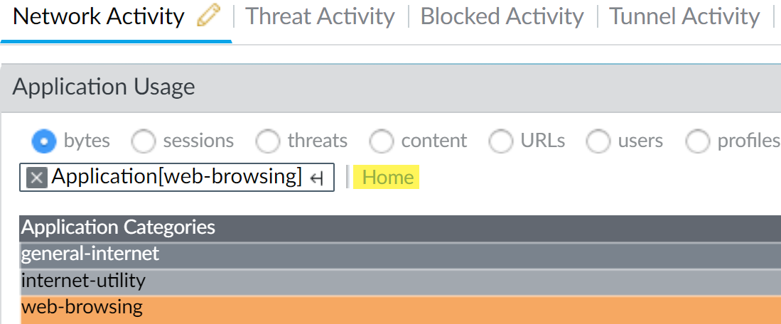 You cannot delete a predefined tab.To delete a widget group/widget, edit the tab and in the workspace section, click the [X] icon on the right. You cannot undo a deletion.Reset the default widgets in a tab.On a predefined tab, such as the Blocked Activity tab, you can delete one or more widgets. If you want to reset the layout to include the default set of widgets for the tab, edit the tab and click Reset View.Zoom in on the details in an area, column, or line graph.Watch how the zoom-in capability works.Click and drag an area in the graph to zoom in. For example, when you zoom into a line graph, it triggers a re-query and the firewall fetches the data for the selected time period. It is not a mere magnification.Use the table drop-down to find more information on an attribute.- Hover over an attribute in a table to see the drop-down.Click into the drop-down to view the available options.