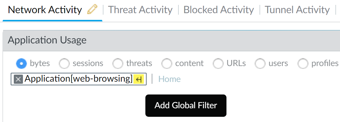 Editing a tab allows you to add or delete or reset the widgets that are displayed in the tab. You can also change the widget layout in the tab.To save the tab as the default tab, select.Export and Import tabs.- Select the tab, and click the pencil icon next to the tab name, to edit the tab.Select theicon to export the current tab as a .txt file. You can share this .txt file with another administrator.To import the tab as a new tab on another firewall, select theicon along the list of tabs, and add a name and click the import icon, browse to select the .txt file.