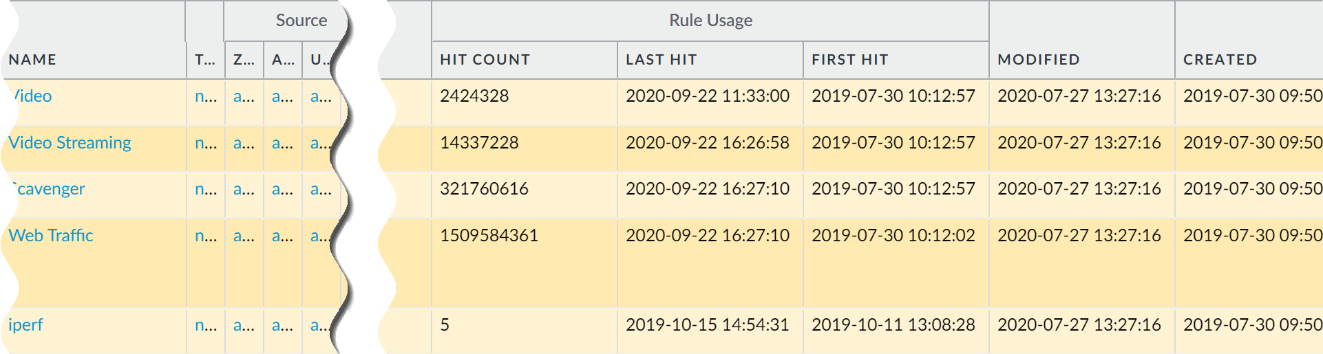 - Created—The date and time the policy rule was created.If the rule was created when Panorama was running PAN-OS 8.1 and the Policy Rule Hit Count setting is enabled, the First Hit date and time is used as the Created date and time on upgrade to PAN-OS 9.0. If the rule was created in PAN-OS 8.1 when the Policy Rule Hit Count setting was disabled or if the rule was created when Panorama was running PAN-OS 8.0 or an earlier release, the Created date for the rule will be the date and time you successfully upgraded Panorama to PAN-OS 9.0