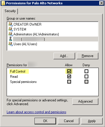 Click OK twice to save the settings.Confirm that the builtin Event Log Reader group lists the service account as a member (Event Log ReadersPropertiesMembers).Assign account permissions to the installation folder to allow the service account to access the agent’s installation folder to read the configuration and write logs.You only need to perform this step if the service account you configured for the User-ID agent is not either a domain administrator or a local administrator on the User-ID agent server host.- From the Windows Explorer, navigate to C:\Program Files(x86)\Palo Alto Networks, right-click the folder, and select Properties.On the Security tab, click Edit.