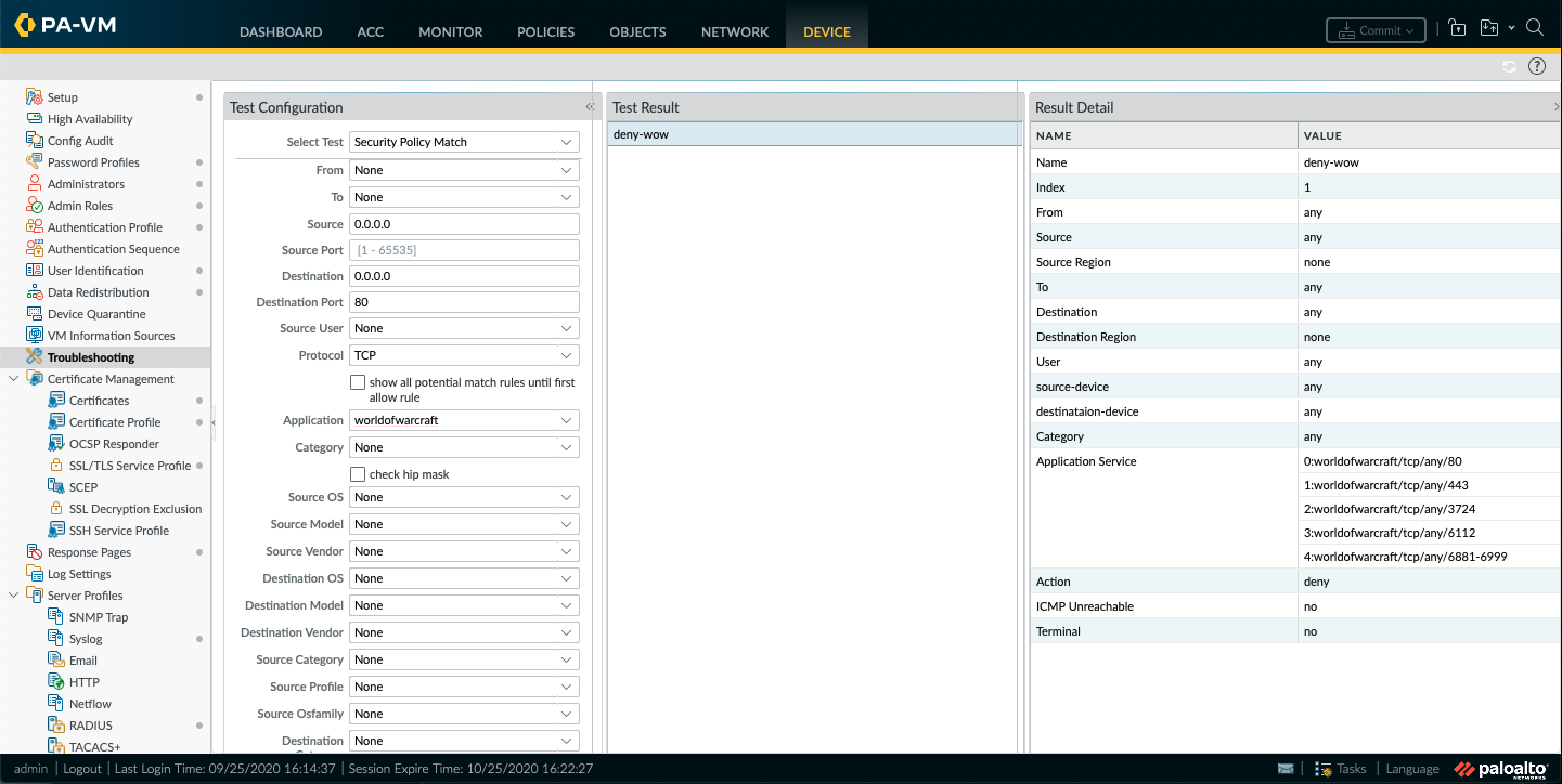 1. Select DeviceTroubleshooting, and select Security Policy Match from the Select Test drop-down.