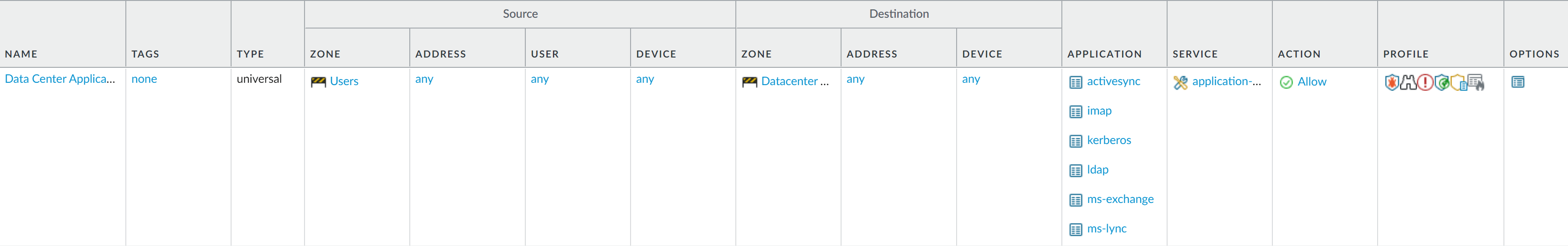 policy rule applies to a traffic flow.For example, to verify the policy rule that will be applied for a client in the user zone with the IP address 10.35.14.150 when it sends a DNS query to the DNS server in the data center: