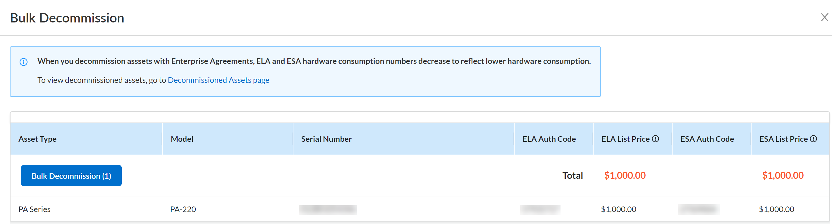 - Decommission the selected assets.Review the assets in the Bulk Decommission list.