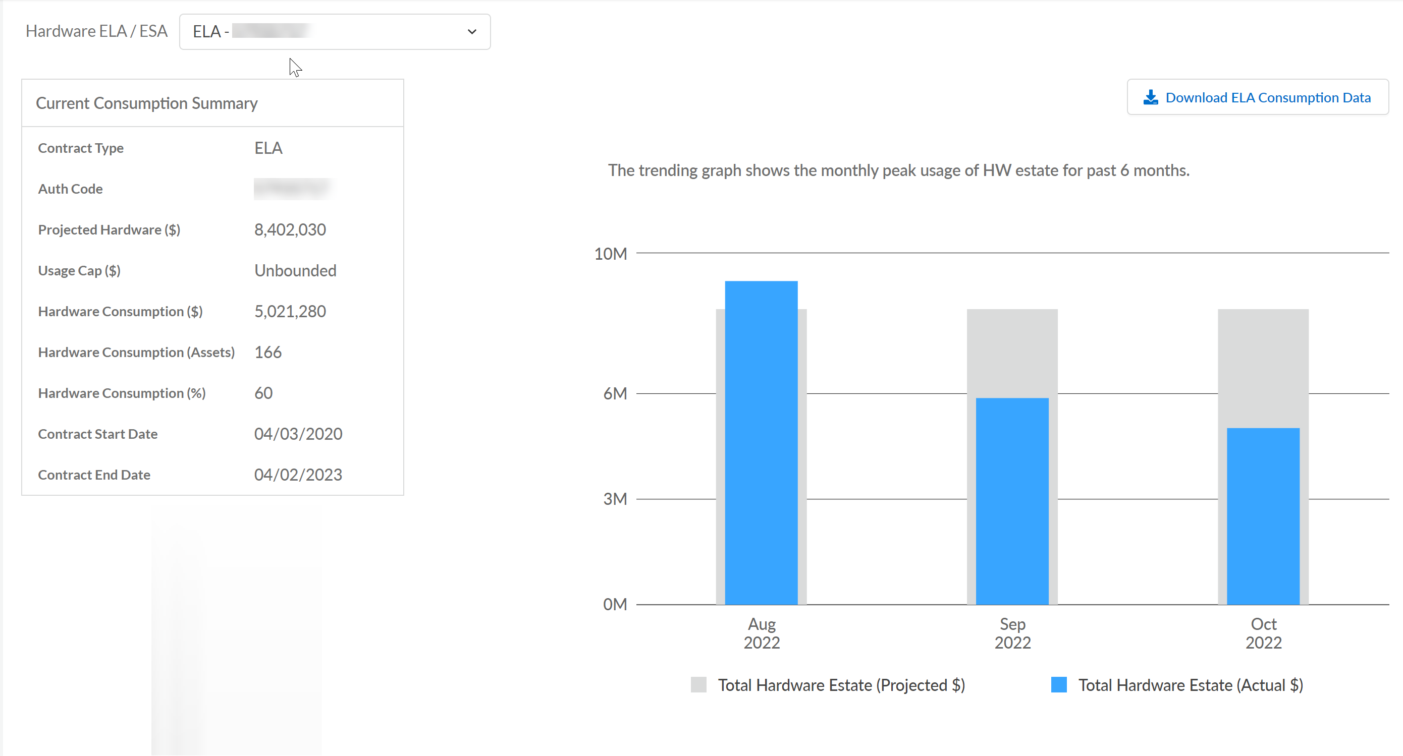 - To view your consumption data, select AssetsEnterprise AgreementsConsumption.Based on the ELA/ESA, view your consumption summary and associated CSP accounts. Changes to assets for activations and decommissions over the past six months are reflected in the summary and associated usage chart. You can also download a CSV file with the consumption data for the account.