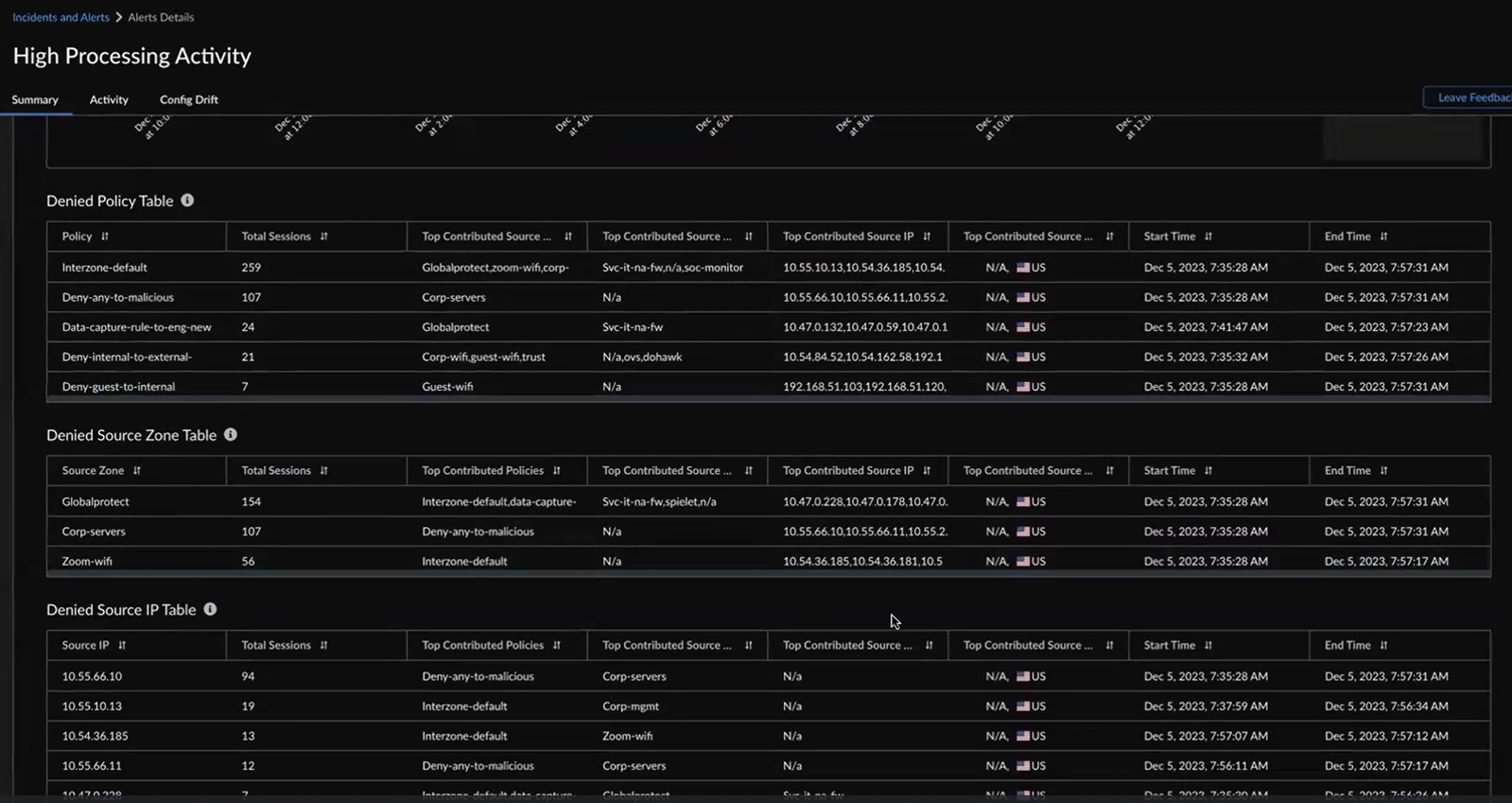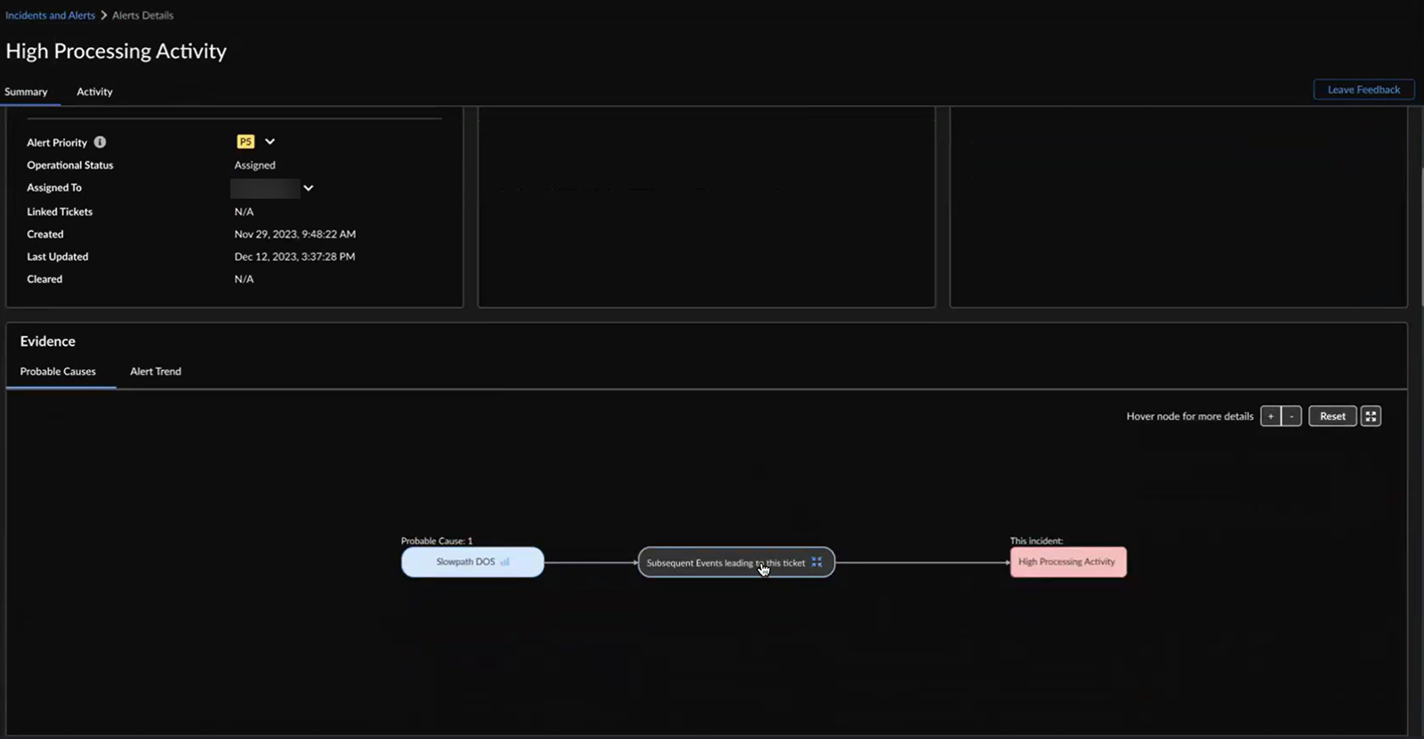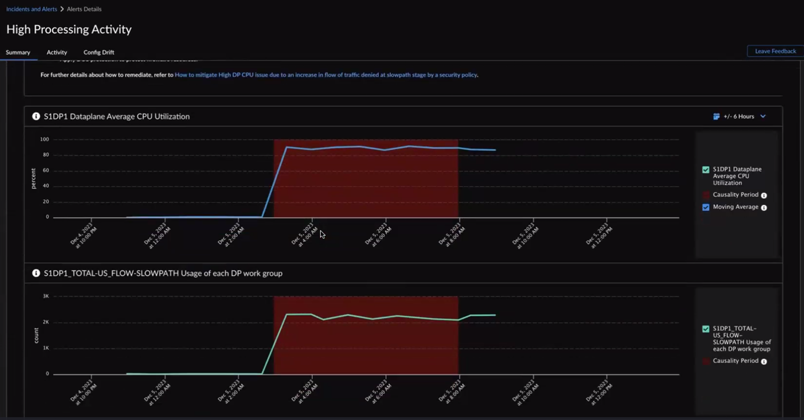The probable cause analysis is enhanced to use the SLS logs and provide additional metadata to the probable cause that led to the creation of an alert or incident. This enhancement allows you to pinpoint the policies, applications, source zones, URLs, source IPs, and regions potentially causing the alert. For example, when the high dataplane CPU usage triggers a High Processing Activity alert, you can utilize the probable cause analysis to identify the primary contributors to the alert and follow the suggested remediation recommendations.