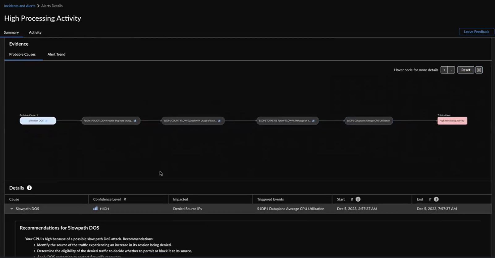 • Slow-Path DoS Attack Detection and Remediation Suggestion (High Processing Activity alert): AIOps for NGFW detects slow-path DoS attacks with AI-powered technology, ensuring network security and uninterrupted service availability. It performs high dataplane processing activity alerts, high policy deny activity root cause analysis, and remediation suggestions based on the causality analysis.