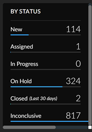 • ASSIGNED TO: Displays the number of incidents by the person or entity who has the task of resolving them. At the top, it shows the incidents assigned to the current logged in user and the unassigned incidents. You can also view the numbers of incidents BY CATEGORY by selecting it in the drop-down list.