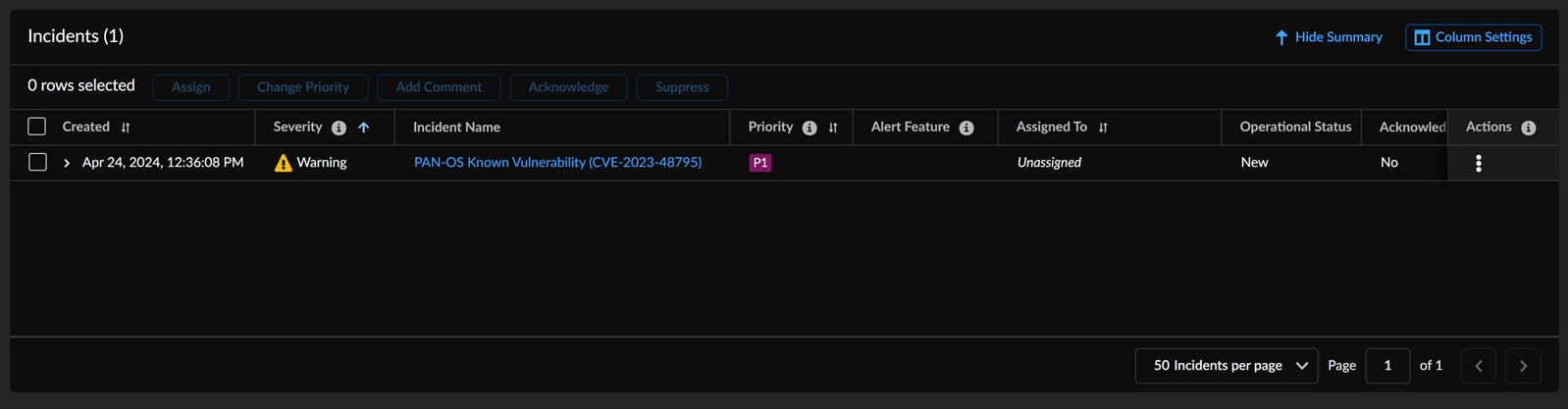 Get a birds-eye view of the NGFW incidents by selecting IncidentsNGFWAll Incidents. Explore the incidents page to keep you informed about changes in your deployment so that you can investigate them and take preventive actions if necessary. You have direct access to a detailed list of incidents alongside critical visual summaries. You can also Hide Summary to hide the widgets and only view the incidents in a tabular format.