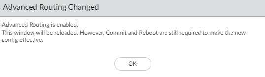 Select Yes to have the migration script convert each virtual router to a logical router and migrate your configuration to the advanced routing engine. (Select Skip to restart the system with an empty configuration. Select Cancel to cancel the process to enable Advanced Routing.)Click OK to approve the migration.