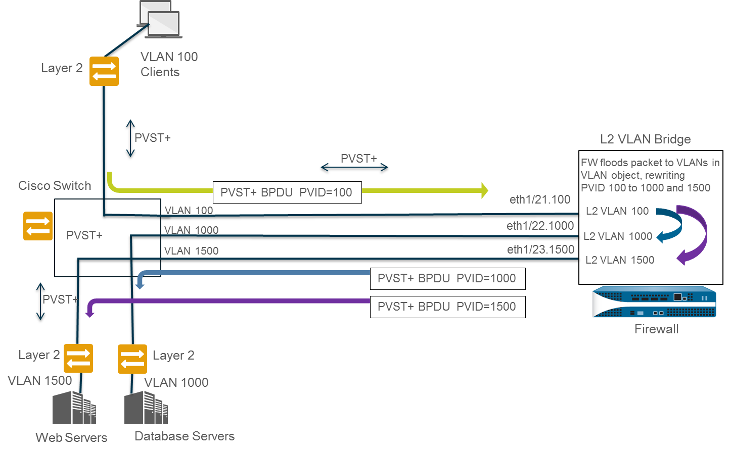3. When the firewall floods the BPDU out through other interfaces (belonging to the same VLAN object), the firewall rewrites the PVID and any 802.1Q VLAN tags to match the VLAN tag of the egress interface. In this example, the firewall rewrites the BPDU PVID from 100 to 1000 for one subinterface and from 100 to 1500 for the second subinterface as the BPDU traverses the Layer 2 bridge on the firewall.