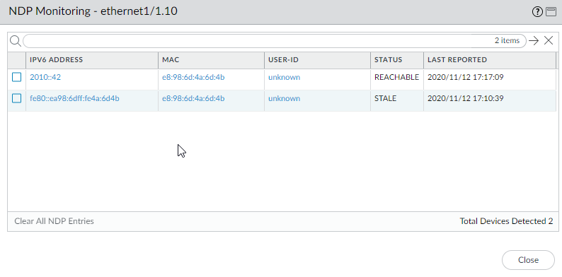 Each row of the detailed NDP Monitoring table for the interface displays the IPv6 address of a neighbor the firewall has discovered, the corresponding MAC address, corresponding User ID (on a best-case basis), reachability Status of the address, and Last Reported date and time this NDP Monitor received an RA from this IP address. A User ID will not display for printers or other non-user-based hosts. If the status of the IP address is Stale, the neighbor is not known to be reachable, per RFC 4861.At the bottom right is the count of Total Devices Detected on the link local network.- Enter an IPv6 address in the filter field to search for an address to display.