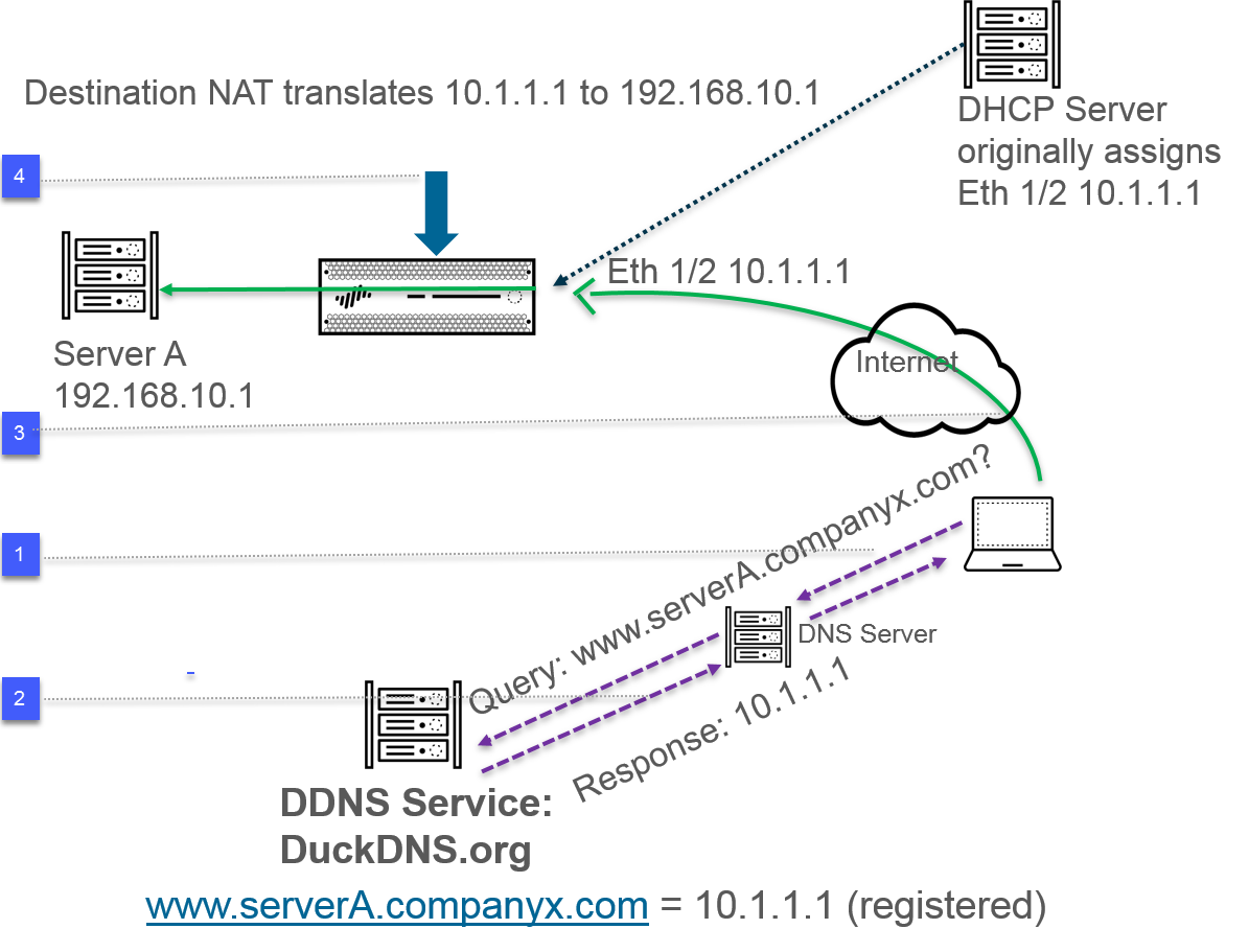 www.serverA.companyx.com and the DNS server checks the DDNS service, the DDNS service