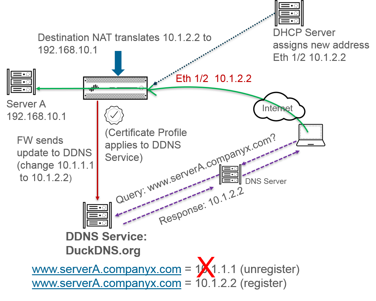 When the firewall receives the new address, it sends an update to the DDNS service