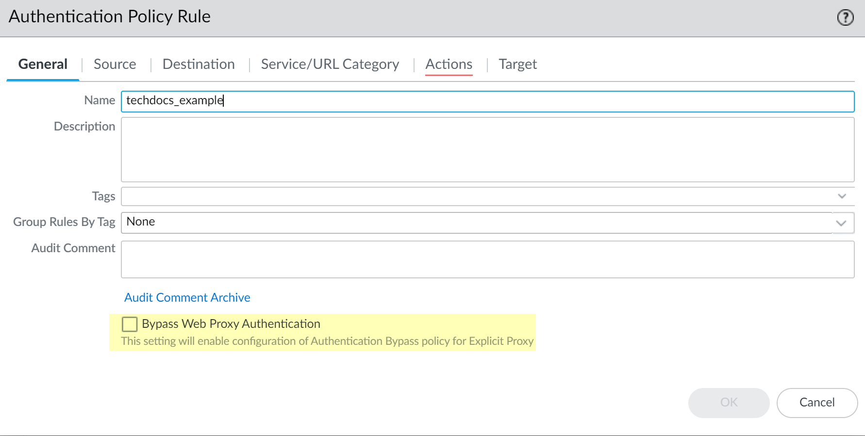 Enable the Authentication Portal if you have not already done so.This step is required to enforce the policy rule.Edit or create your authentication policy rule (PoliciesAuthentication) and select Bypass Web Proxy Authentication.When you enable the Bypass Web Proxy Authentication option, the Authentication Enforcement option on the Action tab is set to None; you cannot change this setting while the Bypass Web Proxy Authentication option is enabled.