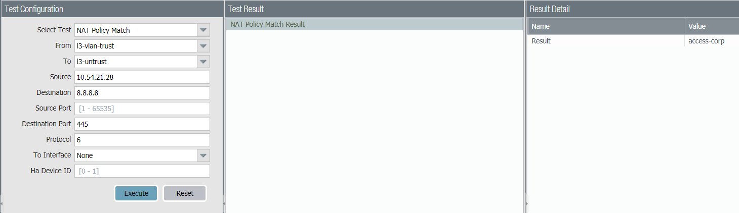 You can verify the NAT rules processed by selecting DeviceTroubleshooting and testing the traffic matches for the NAT rule. For example: