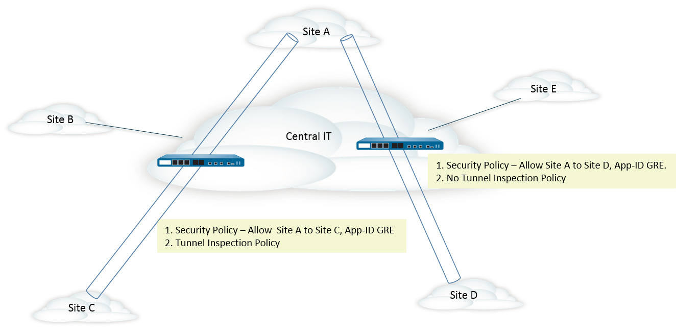 A to Site D. Central IT places a firewall in the path of each tunnel;