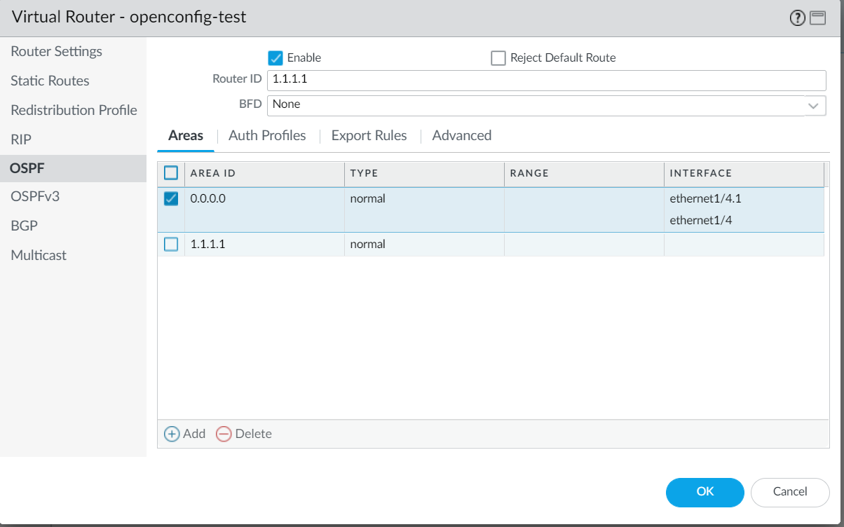 PAN-OS supports the openconfig-ospfv2 model which enables you to manage OSPF