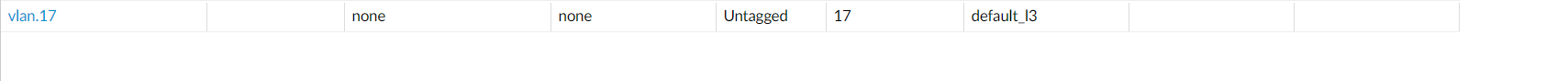 { "config": { "description": "", "enabled": true, "loopback-mode": false, "name": "ethernet1/7", "tpid": "openconfig-vlan-types:TPID_0X8100", "type": "iana-if-type:ethernetCsmacd" }, "openconfig-if-ethernet:ethernet": { "config": { "auto-negotiate": true, "port-speed": "openconfig-if-ethernet:SPEED_UNKNOWN" }, "openconfig-vlan:switched-vlan": { "config": { "native-vlan": 17, "trunk-vlans": [ 15, 16 ] } } }, "openconfig-interfaces:name": "ethernet1/7" }, { "config": { "description": "", "enabled": true, "loopback-mode": false, "name": "vlan.17", "type": "iana-if-type:l3ipvlan" }, "openconfig-interfaces:name": "vlan.17", "openconfig-vlan:routed-vlan": { "config": { "vlan": 17 }, "openconfig-if-ip:ipv4": { "config": { "dhcp-client": false, "mtu": 1500 } }, "openconfig-if-ip:ipv6": { "config": { "dup-addr-detect-transmits": 0, "enabled": false }, "router-advertisement": { "config": { "interval": 600, "lifetime": 1800, "suppress": true } } }