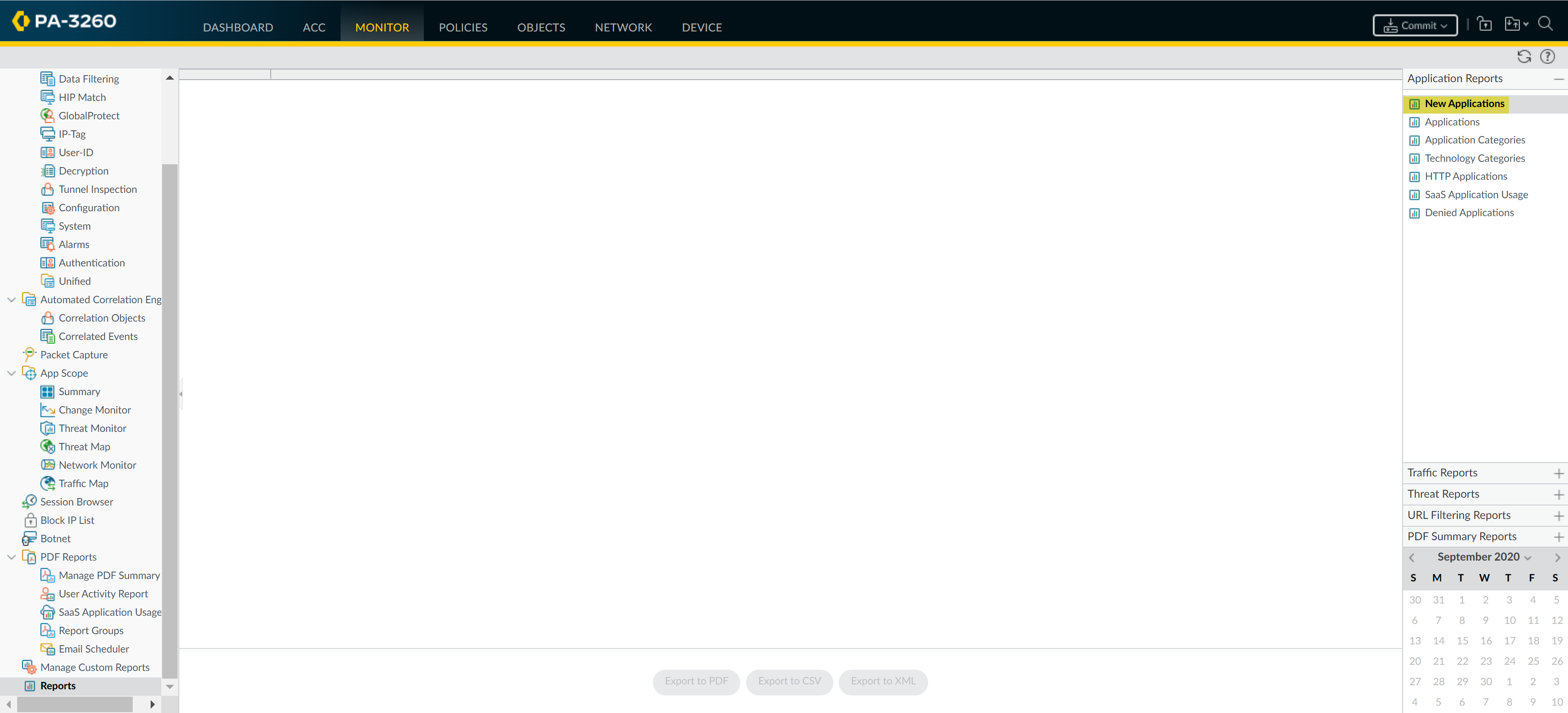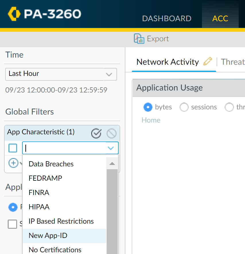 • Use the ACC to monitor new application activity: select ACC and under Global Filters, select ApplicationApplication CharacteristicsNew App-ID.