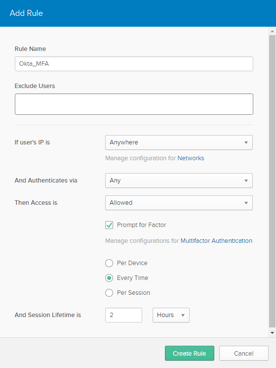 Enter the name of the group or Groups to associate with this user. When you start typing, the group name populates automatically.Check Send user activation email now, then Save to add a single user or Save and Add Another to continue adding users.Assign a test policy to users.- Select SecurityAuthenticationSign On.There is a Default Policy with a Default Rule that does not prompt users to log in with MFA.Enter the Rule Name and check Prompt for Factor to enforce the MFA prompt, and select the type of prompt (Per Device, Every Time, or Per Session), then Create Rule.
