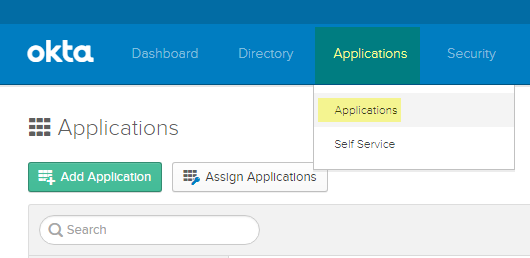 - From the Okta Dashboard, log in with your Okta Admin credentials, then select ApplicationsApplications.