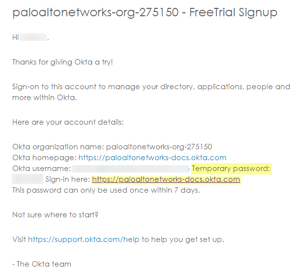 For example, in the example Okta Admin Dashboard URL above, https://paloaltonetworks-doc-admin.okta.com/admin/dashboard:- The API hostname is paloaltonetworks-doc-admin.okta.com.