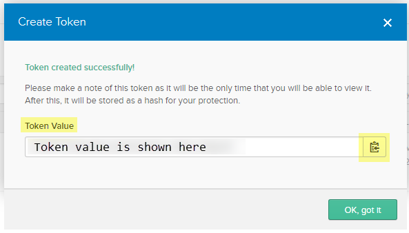 Copy the Token Value.You can click the Copy to clipboard button to copy the Token Value to your clipboard.