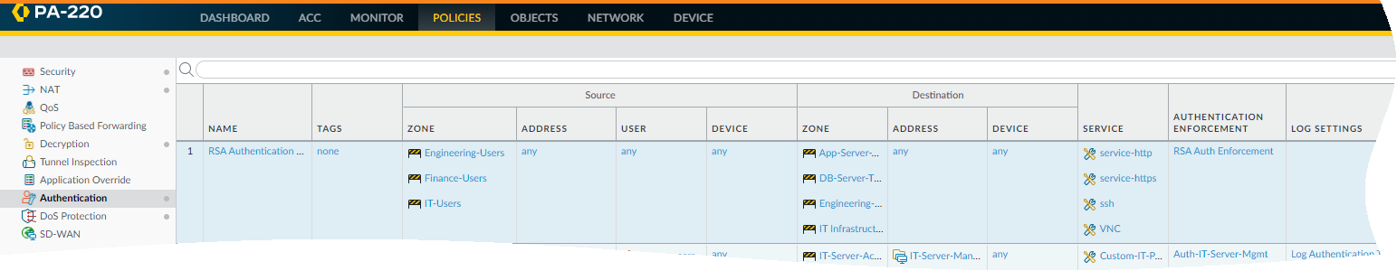 Your authentication policy rule must match the services and applications you want to protect, specify the users who must authenticate, and include the authentication enforcement object that triggers the authentication profile. In this example, RSA SecurID Access authenticates all users who accessing HTTP, HTTPS, SSH, and VNC traffic with the authentication enforcement object called RSA Auth Enforcement (in Actions, select the Authentication Enforcement object).