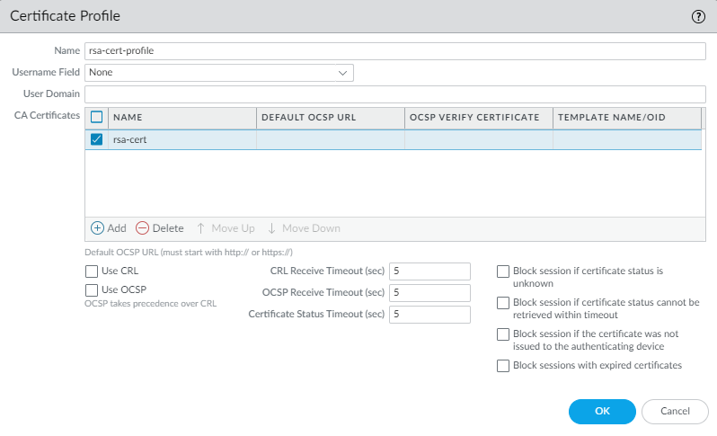 2. Select the Certificate Profile that you created earlier, rsa-cert-profile in this example. The firewall will use this certificate when establishing a secure connection with RSA SecurID cloud service.