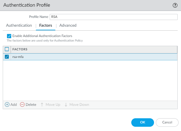 2. Select Factors, Enable Additional Authentication Factors, and Add the rsa-mfa server profile you created earlier in this example.