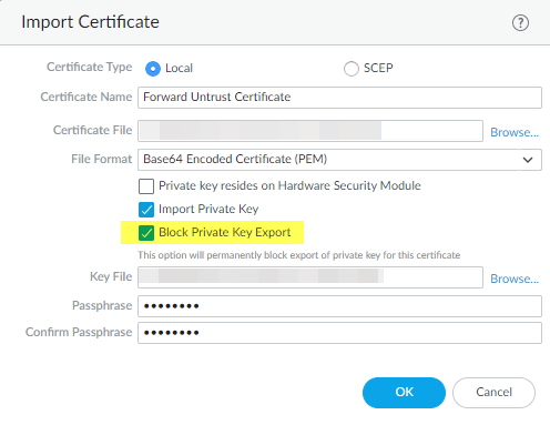 a certificate and include its private key (scp export certificate passphrase <phrase> remote-port <1-65536> to <destination> certificate-name <name> include-key <yes | no> format <der | pem | pkcs10 | pkcs12>),