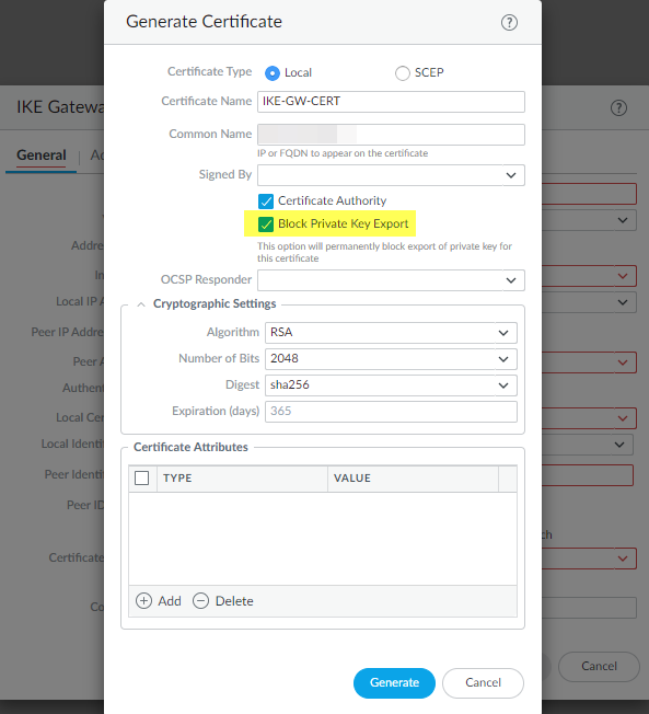 Block the export of a private key to prevent its misuse after generating a certificate for IKE Gateway authentication.