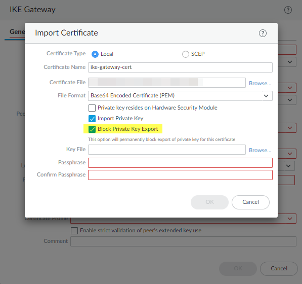 Secure private keys for IKE Gateways that you import into PAN-OS devices by blocking key export.