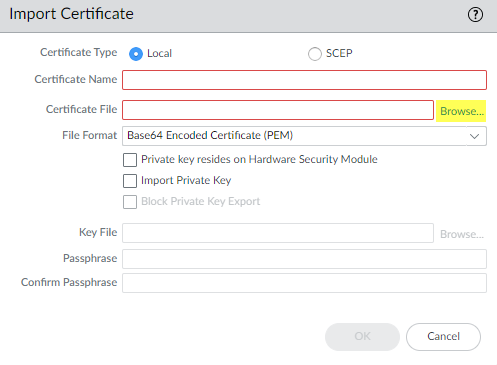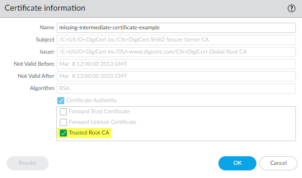 Name the certificate and specify any other options you want to use, then click OK.When the certificate has imported, select the certificate from the Device Certificates list to open the Certificate Information dialog.Select Trusted Root CA to mark the certificate as a Trusted Root CA on the firewall and then click OK.