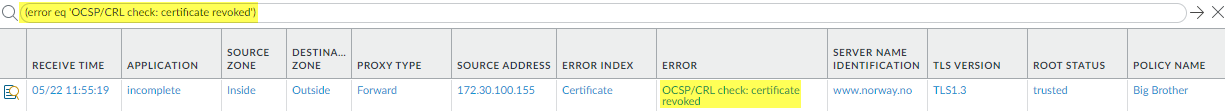 2. Filter the Decryption log (MonitorLogsDecryption) to find certificate revocation errors using the query (error eq ‘OCSP/CRL check: certificate revoked’).