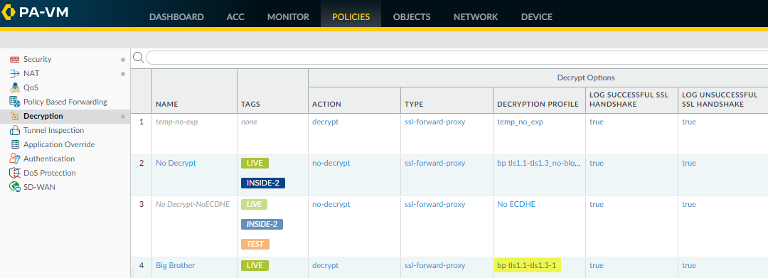 1. In this example, the Decryption policy name is Big Brother; to find the Decryption profile, go to PoliciesDecryption and check the Decryption Profile column.