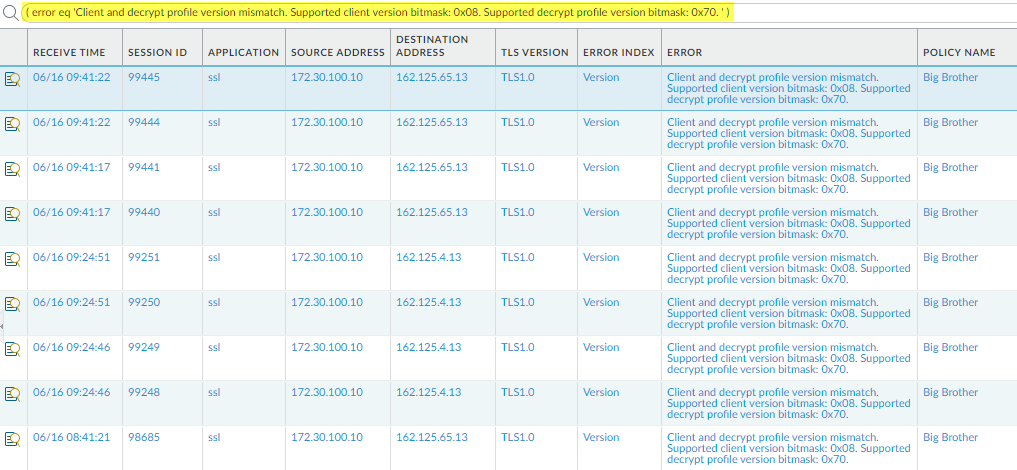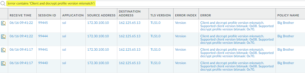 Filtering the logs for these mismatches identifies finds all instances where the client and the Decryption profile cipher suite support don’t match.