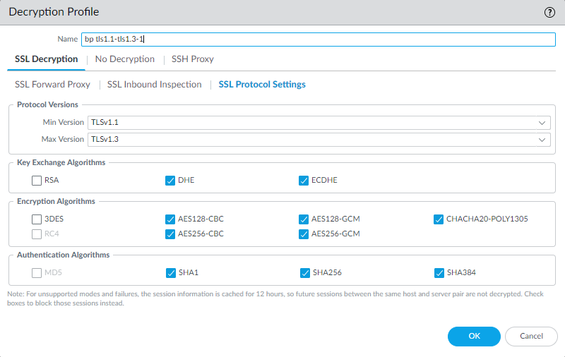 Select the bp tls1.1-tls1.3-1 Decryption profile and click the SSL Protocol Settings tab.