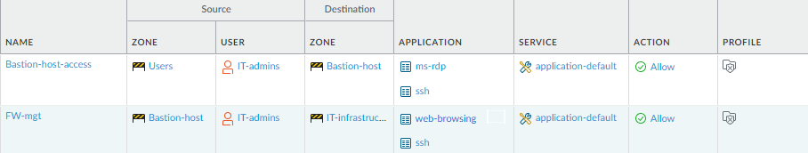 - If you are using a bastion host to enable access to your management network, you need two security policy rules: one rule to allow access from user zone to the bastion host zone and a second rule to allow access from the bastion host zone to the IT infrastructure zone. Again, both of these security policy rules should be as granular as possible and include source zone, address (if available), user and destination zone and address, and the App-ID. Keep in mind that if you are using a bastion host, the user IP address is usually the IP address of the bastion host so you cannot identify the User-ID for the administrator unless you are using the Terminal Server agent on the bastion host to identify individual users. In this case, you must also attach a Vulnerability Protection profile to both rules, as described in the next section.In the example rules that follow, the first rule allows access from the Users zone to the Bastion-host zone for users in the IT-admins group who are attempting to access the specified bastion server IP address over SSH and/or RDP. The second rule allows access to users from the Bastion-host zone to the IT-infrastructure zone attempting to access the web-browsing application on the default port on the firewall with the specified destination address.
