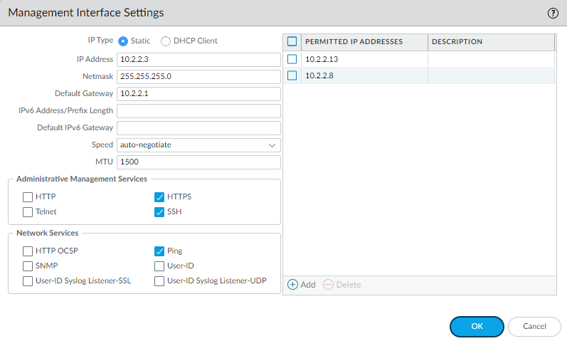 - If you are using the MGT port as your management interface, select DeviceSetupInterfaces and select the Management interface to configure the settings to restrict who can access the management interface and what services the interface allows.
