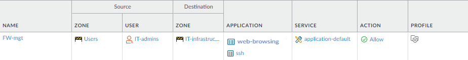 - If you are not using a bastion host to isolate your management network, create a security policy rule to allow access from the Users zone to the IT Infrastructure zone. This security policy rule must be very granular and specify the source zone, source IP address (if available), and source user group of the user attempting to access the management interface, as well as the destination zone, IP address of the appliance (firewall or Panorama), and the App-ID to identify the specific management application (web interface or CLI) running on the application default port. For example, you would use the web-browsing App-ID to allow access to the web interface and the ssh App-ID to allow access to the CLI. You must also attach a Vulnerability Protection profile to the rule, as described in the next section.The following example rule allows access from the users zone directly to the IT Infrastructure zone, and restricts access to users in the IT-admins group who are attempting to access the management interface IP address to access the web-browsing application on the application-default port only: