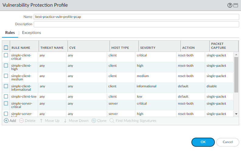 - Attach a best practice Vulnerability Protection profile to the security policy rules that allow access in to your management network to protect against buffer overflows, illegal code execution, and other attempts to exploit client- and server-side vulnerabilities. To create a profile for the purpose of protecting your management interface, clone the strict profile and then enable extended packet capture to help you track down the source of any potential attacks.